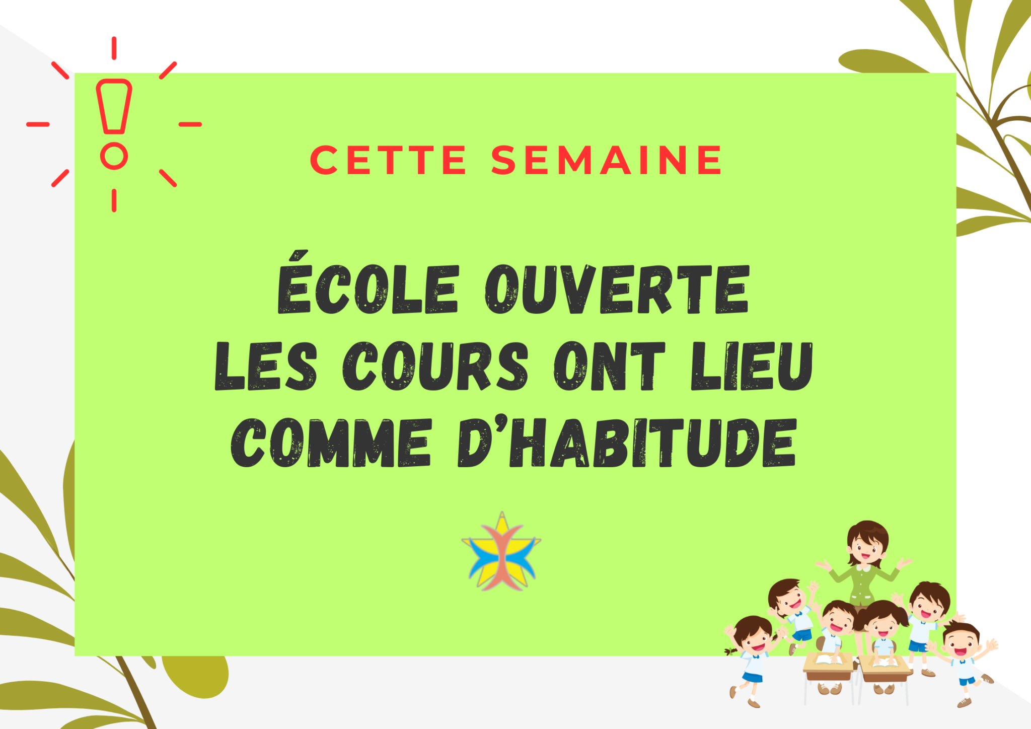 Chers parents, Voici un rappel des heures d’ouverture et de fermeture de notre école. Merci à vous pour votre ponctualité. Belle journée, La direction et l’équipe éducative